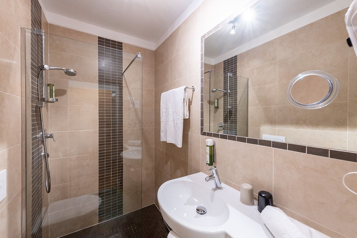 Zimmer mit Holzoptik Designboden, gemütliches Boxspringbett, hochwertige, moderne Einbaumöbel, Wandsafe, Tisch aus Kastanienholz mit zwei Stühlen, Flachbildfernseher mit Sat-TV, Balkon mit Blick auf die Kastanienhaine, Tisch und Stühle sowie Liegen zum genießen der Nachmittagssonne, Badezimmer mit WC, Dusche und Haartrockner, Bademäntel und Badeslipper, Kostenloses WLAN.