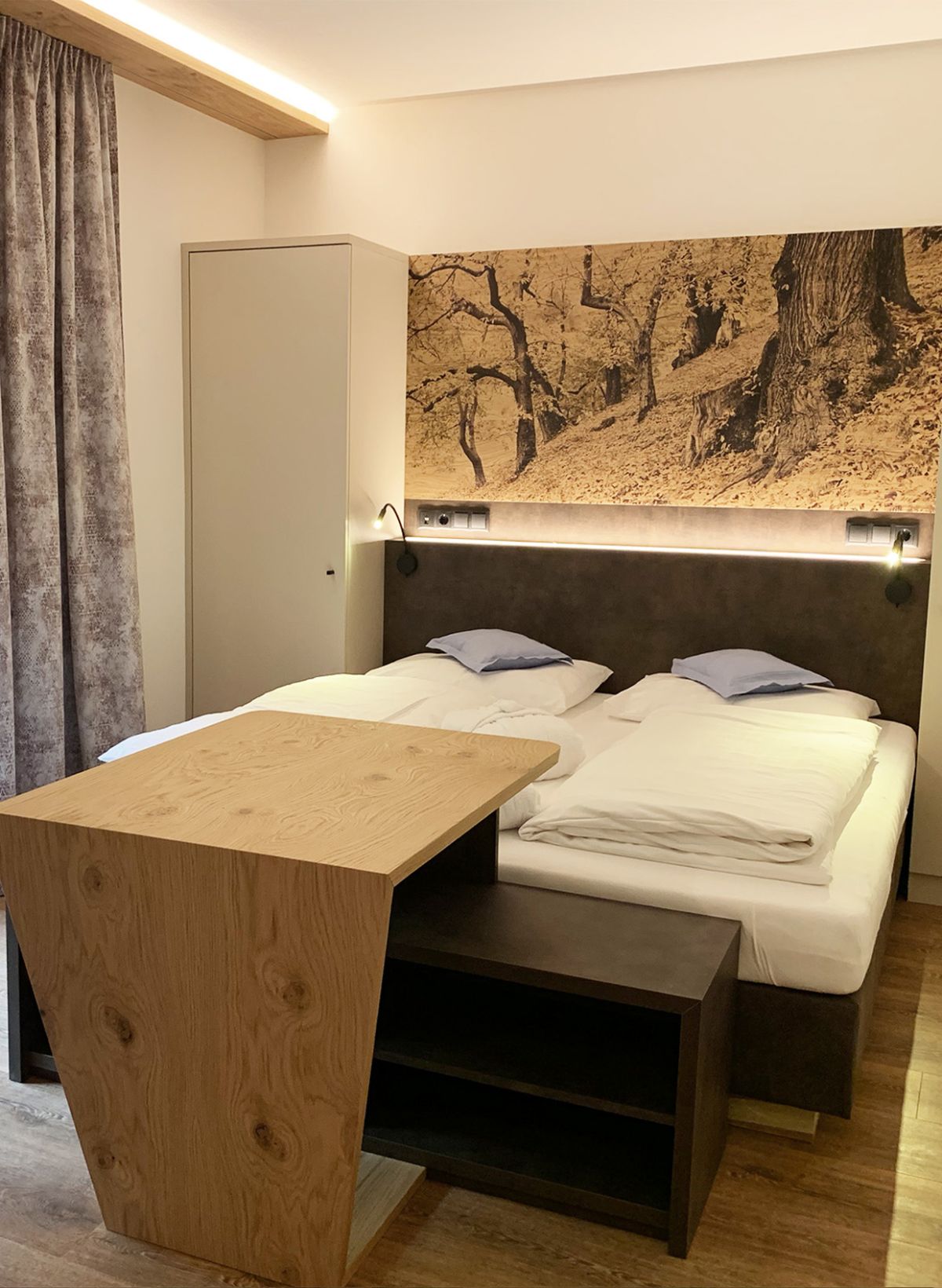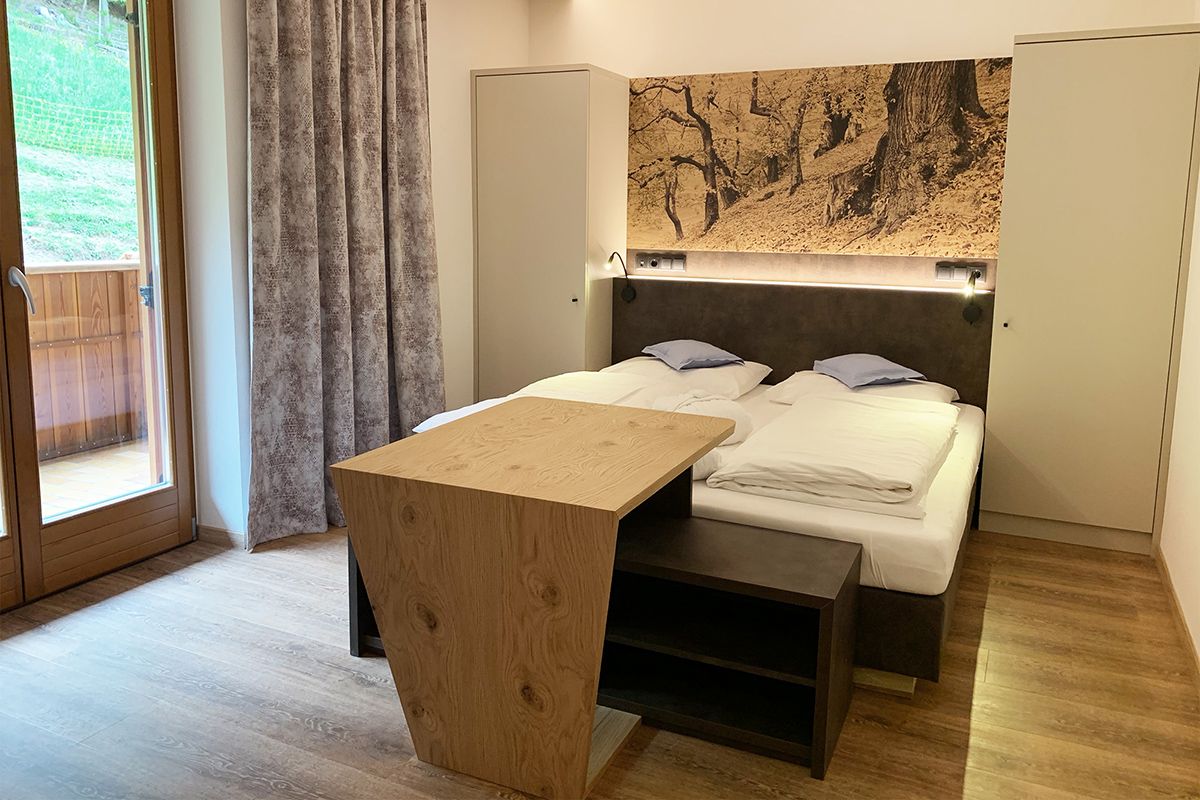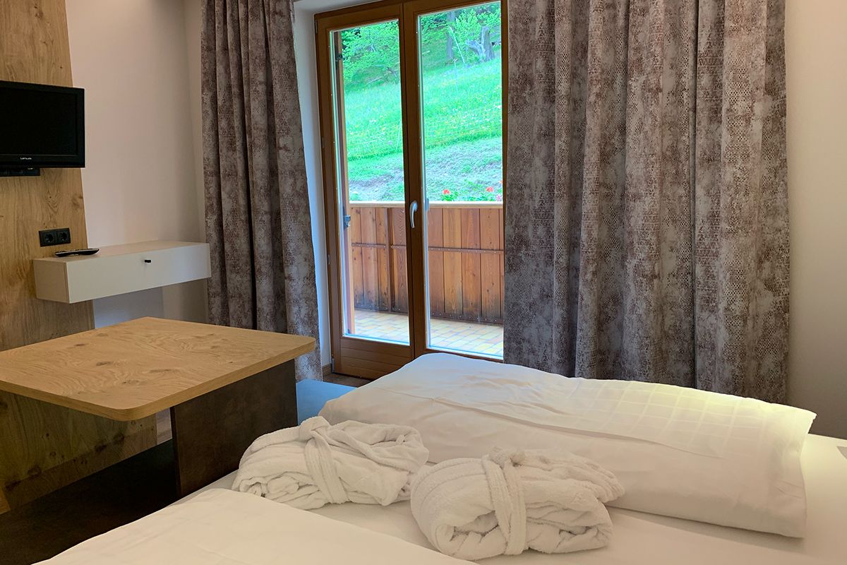 Zimmer mit Holzoptik Designboden, gemütliches Boxspringbett, hochwertige Einbaumöbel, Wandsafe, Flachbildfernseher mit Sat-TV, Balkon mit Blick auf die Kastanienhaine, Tisch und Stühle sowie Liegen zum genießen der Nachmittagssonne, Badezimmer mit WC, Dusche und Haartrockner, Bademäntel und Badeslipper, Kostenloses WLAN.
