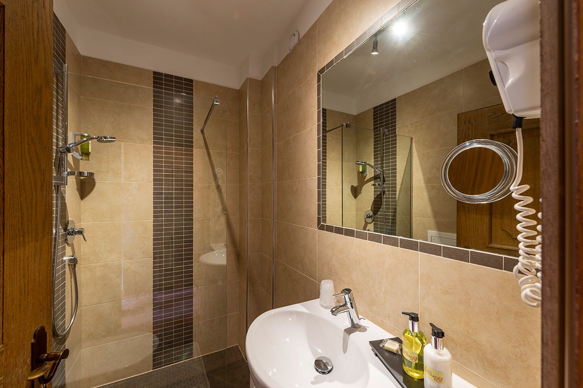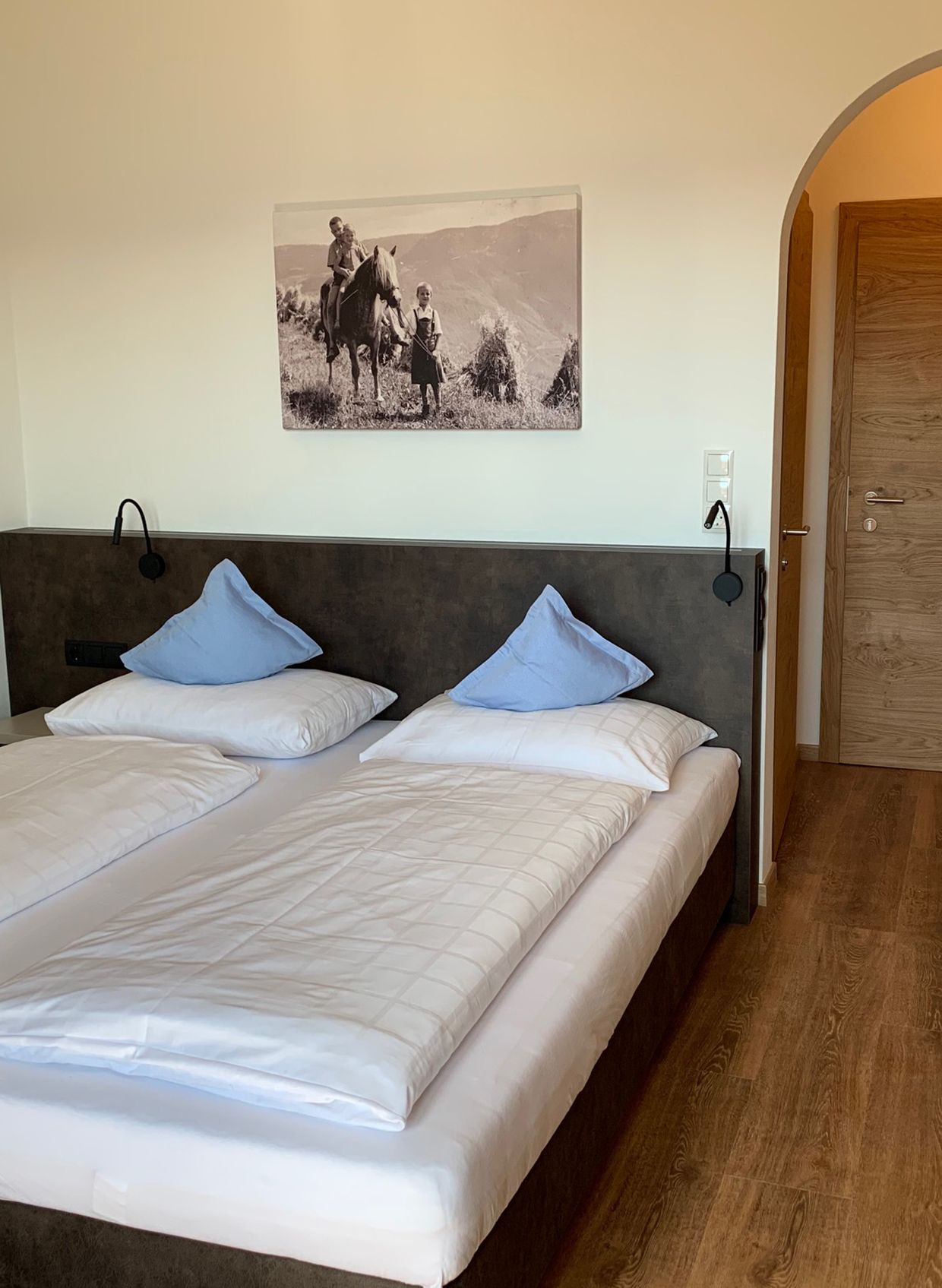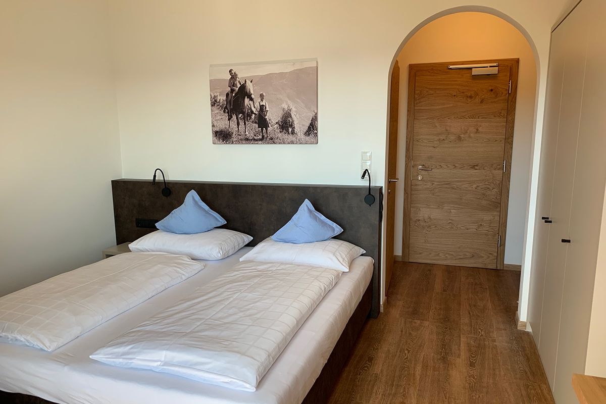 Zimmer mit Holzoptik Designboden, hochwertige Einbaumöbel, gemütliches Boxspringbett, Wandsafe, Tisch aus Kastanienholz mit zwei Stühlen, Flachbildfernseher mit Sat-TV, Balkon mit Blick ins Tal bis nach Bozen und auf die imposante Bergwelt der Dolomiten mit dem rot glühenden Rosengarten, Tisch und Stühle sowie Liegen zum Entspannen, Badezimmer mit WC, Dusche und Haartrockner, Bademäntel und Badeslipper, kostenlos WLAN.
