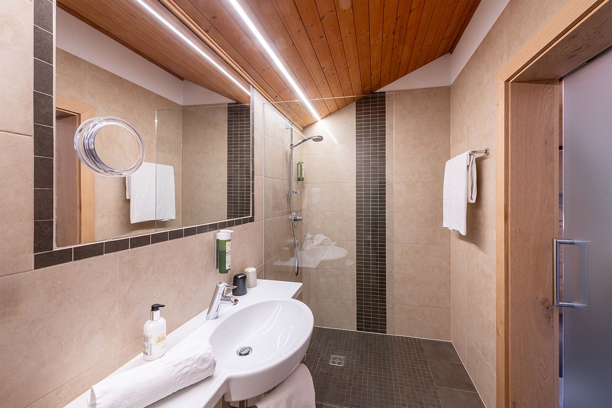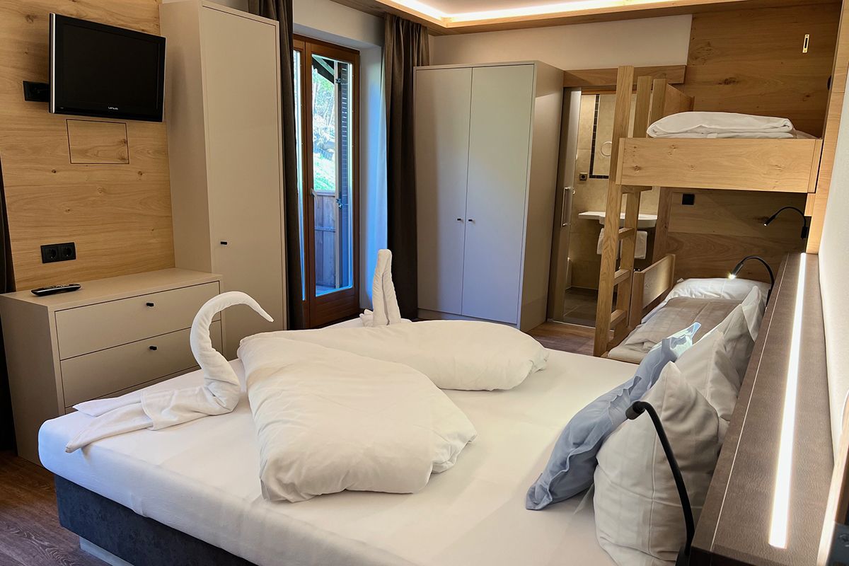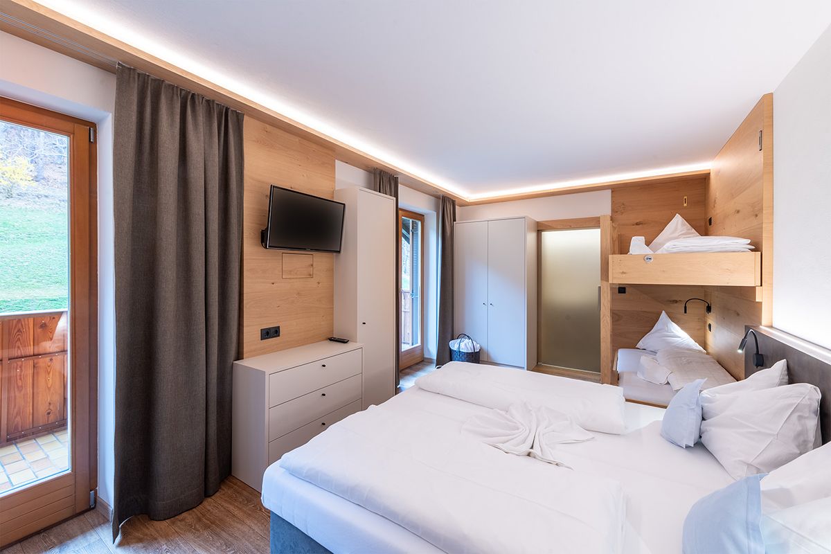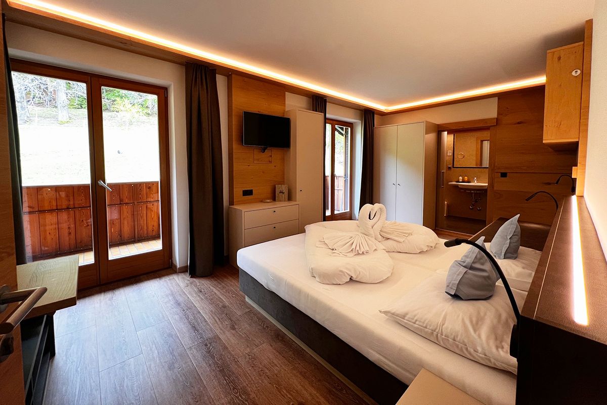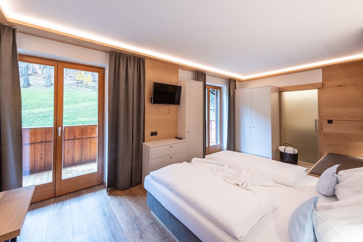Camera con pavimento di design effetto legno, comodo letto a molle, mobili a incasso moderni e di alta qualità, cassaforte a muro, angolo soggiorno in legno di castagno, TV a schermo piatto con TV satellitare, balcone con vista sul castagneto, tavolo e sedie a sdraio per godersi il sole del pomeriggio, bagno con WC, doccia e asciugacapelli, accappatoi e pantofole da bagno. WiFi gratuito.