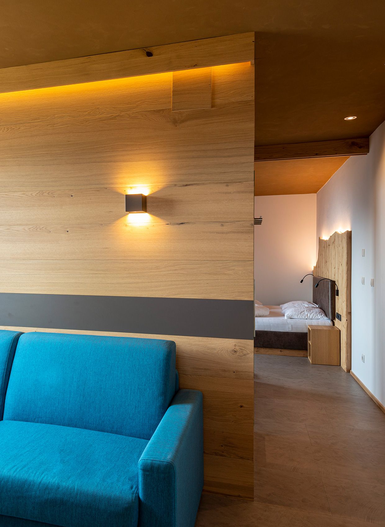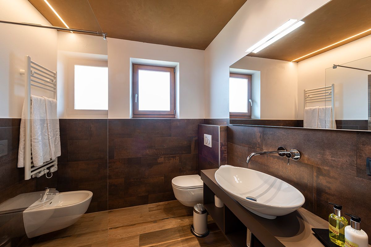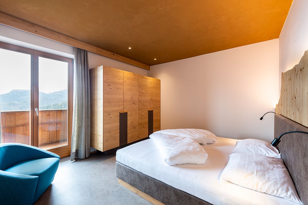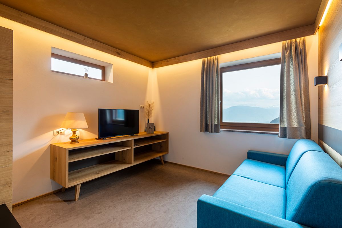 Pavimento in vinile, arredi in legno naturale, letto matrimoniale Boxspring, cassaforte, zona giorno separata con divano trasformabile in letto matrimoniale, TV in entrambe le zone. Grande balcone esposto a sud con vista fino a Bolzano e alle Dolomiti (Rosengarten). Tavolo, sedie e lettino per il relax. Ampio bagno con finestra, WC, doccia, bidet, asciugacapelli, accappatoi e pantofole. Ideale per famiglie, ospita fino a 5 persone con culla. WiFi gratuito.